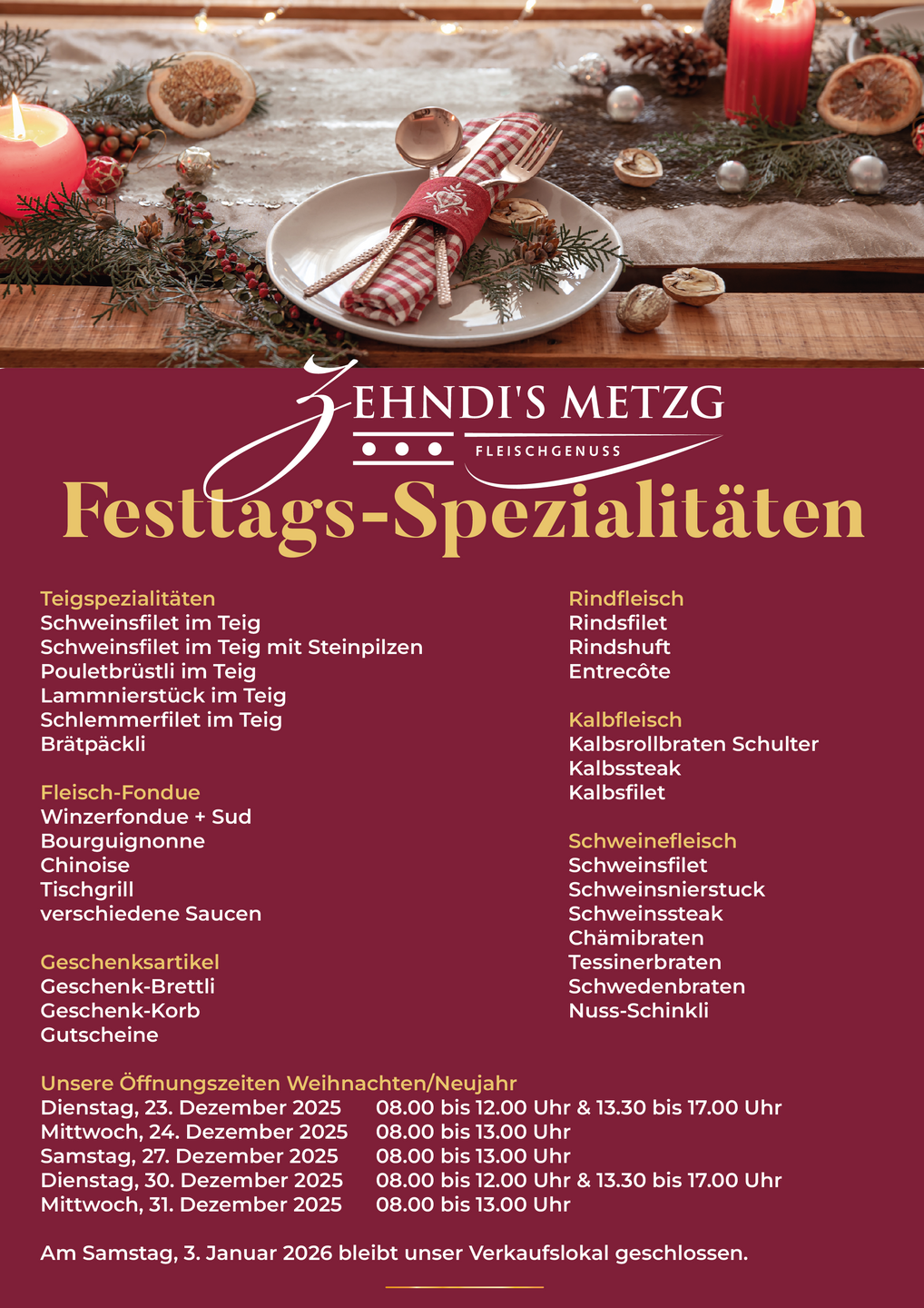 Die Zehndi's Metzg GmbH ist ein Familienbetrieb. Wir, Brigitte und Urban Zehnder, stehen persönlich mit unserem Namen für hochwertigen Fleischgenuss, nachhaltig produzierte Produkte, persönliche Beratung und faire Preise. Als Nachfolger des langjährigen Firmeninhabers und Geschäftsführers, Manfred Zeller, führen wir den Betrieb seit 1. Januar 2023 zu den gewohnten Leistungen und Konditionen weiter.